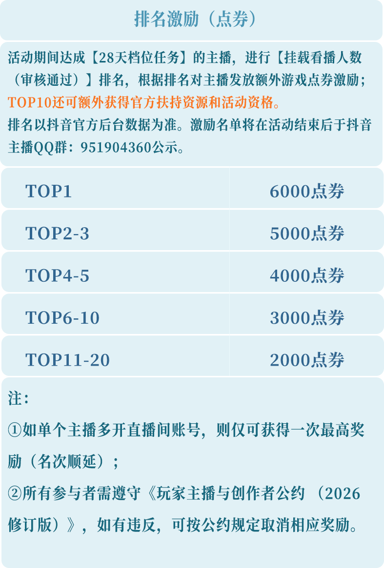 1、严禁出现挂播、录播等行为,直播过程中主播需真实出镜与游戏操作,确保直播内容实时有效。若发现此类情况,一经核实,立即取消该主播活动参与资格及所有奖励。